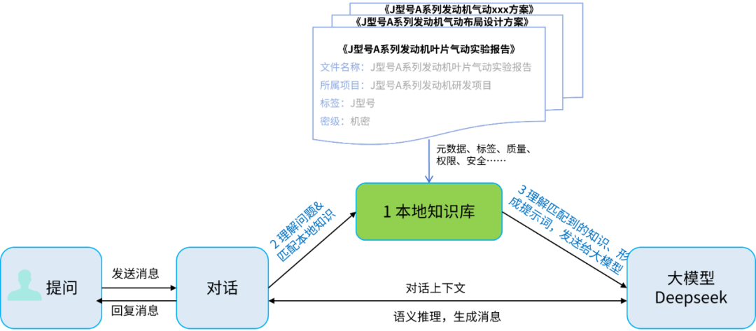通過自然語言處理技術(shù),對用戶問題進(jìn)行語義分析,提取關(guān)鍵信息,然后與本地知識庫中的數(shù)據(jù)進(jìn)行匹配,找到與問題最相關(guān)的文件或文檔片段(如系統(tǒng)會(huì)查詢J型號相關(guān)文件中與葉片進(jìn)氣參數(shù)設(shè)計(jì)值相關(guān)的內(nèi)容。通過匹配算法,確定與問題最相關(guān)的文檔或文檔片段)。