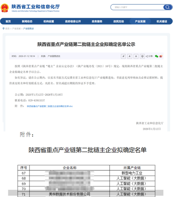 近期,陜西省工業(yè)和信息化廳按照《陜西省重點產(chǎn)業(yè)鏈“鏈主”企業(yè)認(rèn)定辦法》(陜產(chǎn)業(yè)鏈辦發(fā)〔2021〕10號)規(guī)定,公示新一批陜西省重點產(chǎn)業(yè)鏈鏈主企業(yè)擬確定名單,美林?jǐn)?shù)據(jù)技術(shù)股份有限公司入人工智能(大數(shù)據(jù))產(chǎn)業(yè)鏈鏈主企業(yè)。
