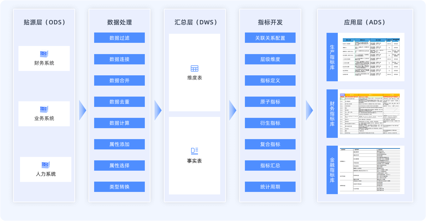 以數(shù)據(jù)資產(chǎn)整合與業(yè)務(wù)數(shù)字化管理為目標(biāo),構(gòu)建全業(yè)務(wù)鏈條的數(shù)據(jù)建模與指標(biāo)管理體系,整合多源數(shù)據(jù)構(gòu)建維度表與事實(shí)表,按“原子-衍生-復(fù)合”流程開發(fā)指標(biāo)形成指標(biāo)庫,依托平臺(tái)實(shí)現(xiàn)指標(biāo)全流程線上化與全生命周期管理。