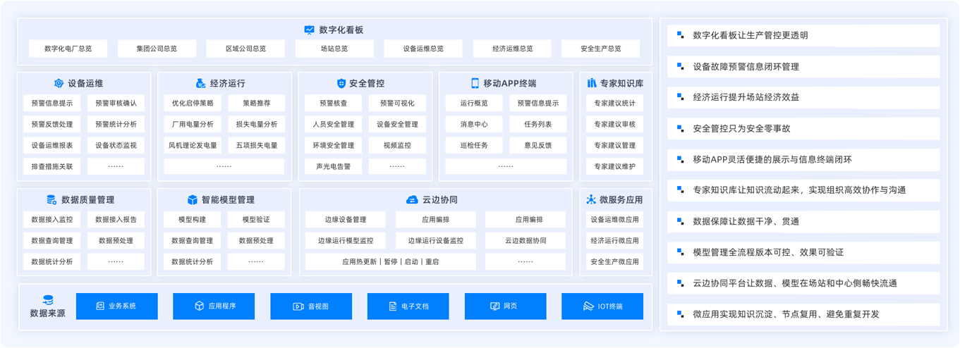 以“安全高效生產(chǎn)”為核心,以數(shù)字化為手段,穿透新能源電廠生產(chǎn)數(shù)據(jù),透視“人、機、料、法、環(huán)”與生產(chǎn)業(yè)務(wù)關(guān)系,實現(xiàn)設(shè)備高效運維、降低運營成本、強化安全風(fēng)險管控,提高企業(yè)在電力市場中的競爭力。該方案已在多家電力龍頭企業(yè)落地應(yīng)用,總計接入風(fēng)電機組4萬余臺,光伏場站500余個,總裝機容量超過150GW。