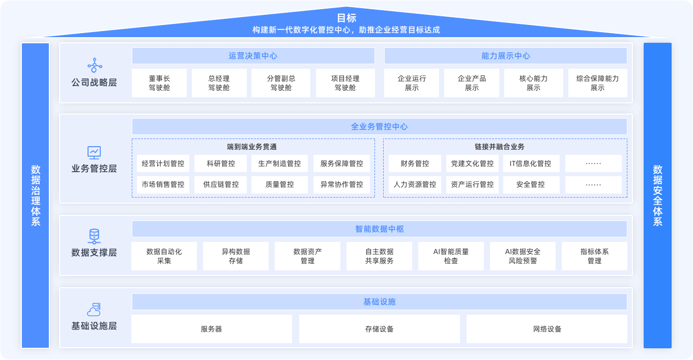 依托智能數(shù)據(jù)中樞底座,以價(jià)值為導(dǎo)向,以三大管控中心為核心抓手,構(gòu)建“全要素互聯(lián)、全流程智能、全場(chǎng)景協(xié)同”的智慧運(yùn)營(yíng)體系,打造敏捷高效、持續(xù)進(jìn)化的數(shù)字化中樞,實(shí)現(xiàn)運(yùn)營(yíng)全鏈條數(shù)字化賦能,打造數(shù)據(jù)驅(qū)動(dòng)的企業(yè)核心競(jìng)爭(zhēng)力。