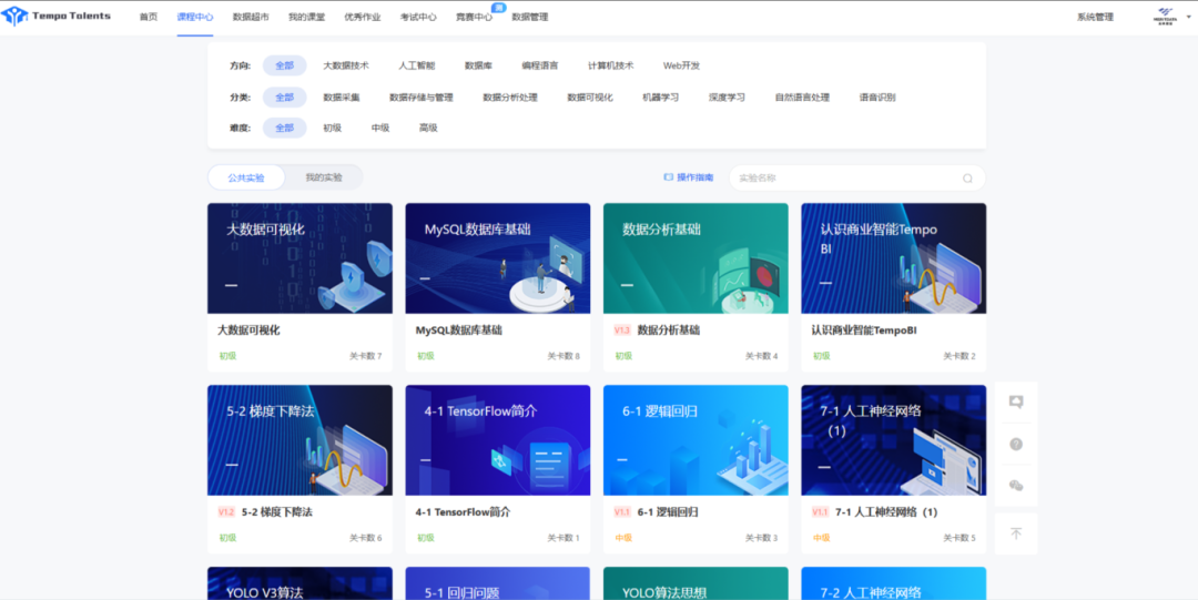 ?覆蓋多領(lǐng)域知識(shí)點(diǎn)的課程實(shí)驗(yàn) 課程實(shí)驗(yàn)旨在通過(guò)實(shí)踐操作來(lái)加深學(xué)生對(duì)理論知識(shí)的理解,并培養(yǎng)他們的實(shí)踐技能和解決問(wèn)題的能力。TT平臺(tái)圍繞高校的人才培養(yǎng)目標(biāo),以及大數(shù)據(jù)領(lǐng)域?qū)I(yè)人才能力需求,打造包含數(shù)據(jù)采集、數(shù)據(jù)存儲(chǔ)、數(shù)據(jù)分析、數(shù)據(jù)應(yīng)用等上千個(gè)覆蓋大數(shù)據(jù)領(lǐng)域技術(shù)知識(shí)點(diǎn)的課程實(shí)驗(yàn)。課程體系豐富多樣,從入門(mén)、熟練到精通應(yīng)用的落實(shí),專業(yè)系統(tǒng)的課程設(shè)計(jì)讓學(xué)生將每一個(gè)知識(shí)點(diǎn)吃透和掌握,全面培養(yǎng)學(xué)生應(yīng)用能力,提升綜合數(shù)據(jù)素養(yǎng)。