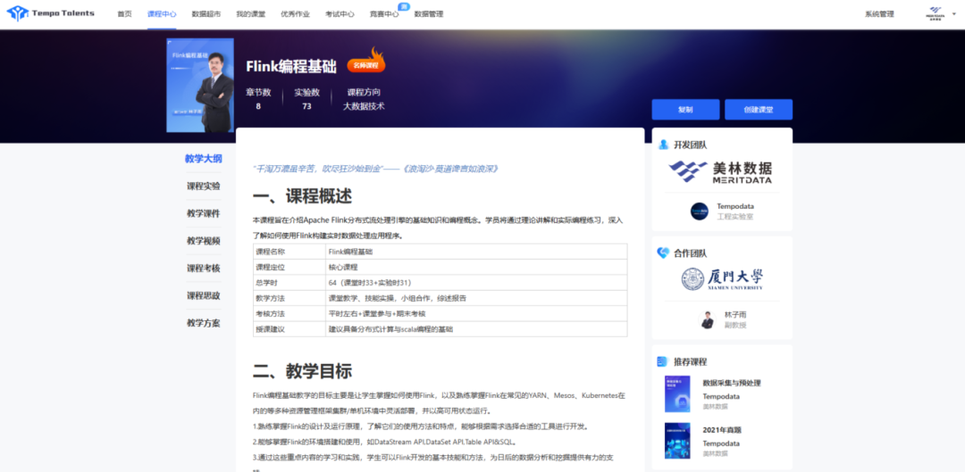 以【Flink編程基礎(chǔ)】為例,該課程是美林?jǐn)?shù)據(jù)聯(lián)合教學(xué)名師—廈門(mén)大學(xué)林子雨老師,共同打造的專業(yè)課程,包含完整的教學(xué)大綱以及配套的課程實(shí)驗(yàn)、教學(xué)課件、教學(xué)視頻、課程考核、課程思政、教案等資源。
