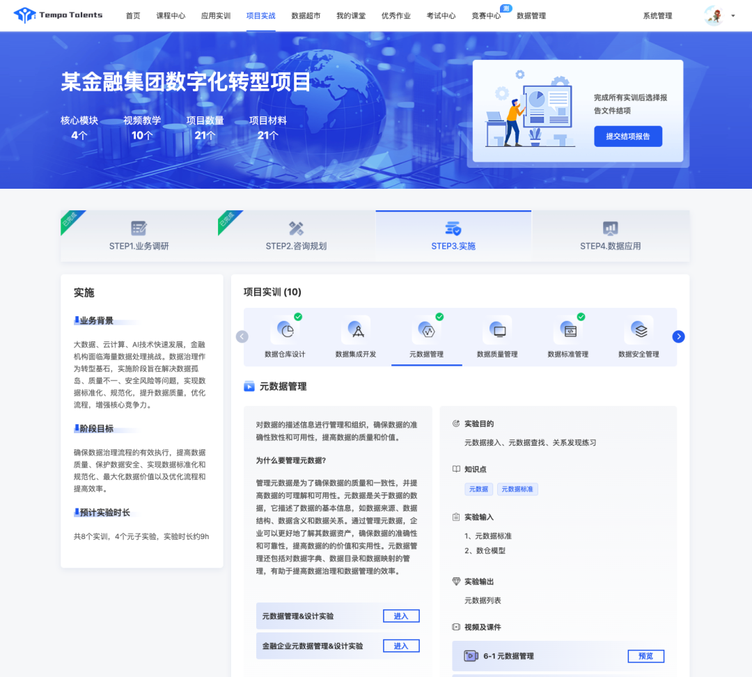 在實訓(xùn)平臺中,我們創(chuàng)新性地引入了“數(shù)據(jù)治理項目應(yīng)用實戰(zhàn)”模塊,該模塊緊密依托產(chǎn)業(yè)側(cè)在數(shù)字化轉(zhuǎn)型落地過程中的真實數(shù)據(jù)治理項目,通過場景的精細(xì)拆解與高度還原,巧妙融合教學(xué)規(guī)律,從知識、技能與方法論三個維度,系統(tǒng)性地培養(yǎng)學(xué)生的數(shù)據(jù)治理綜合實戰(zhàn)能力: